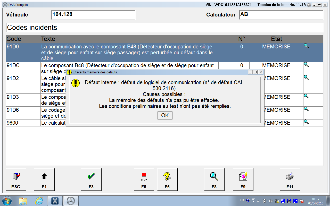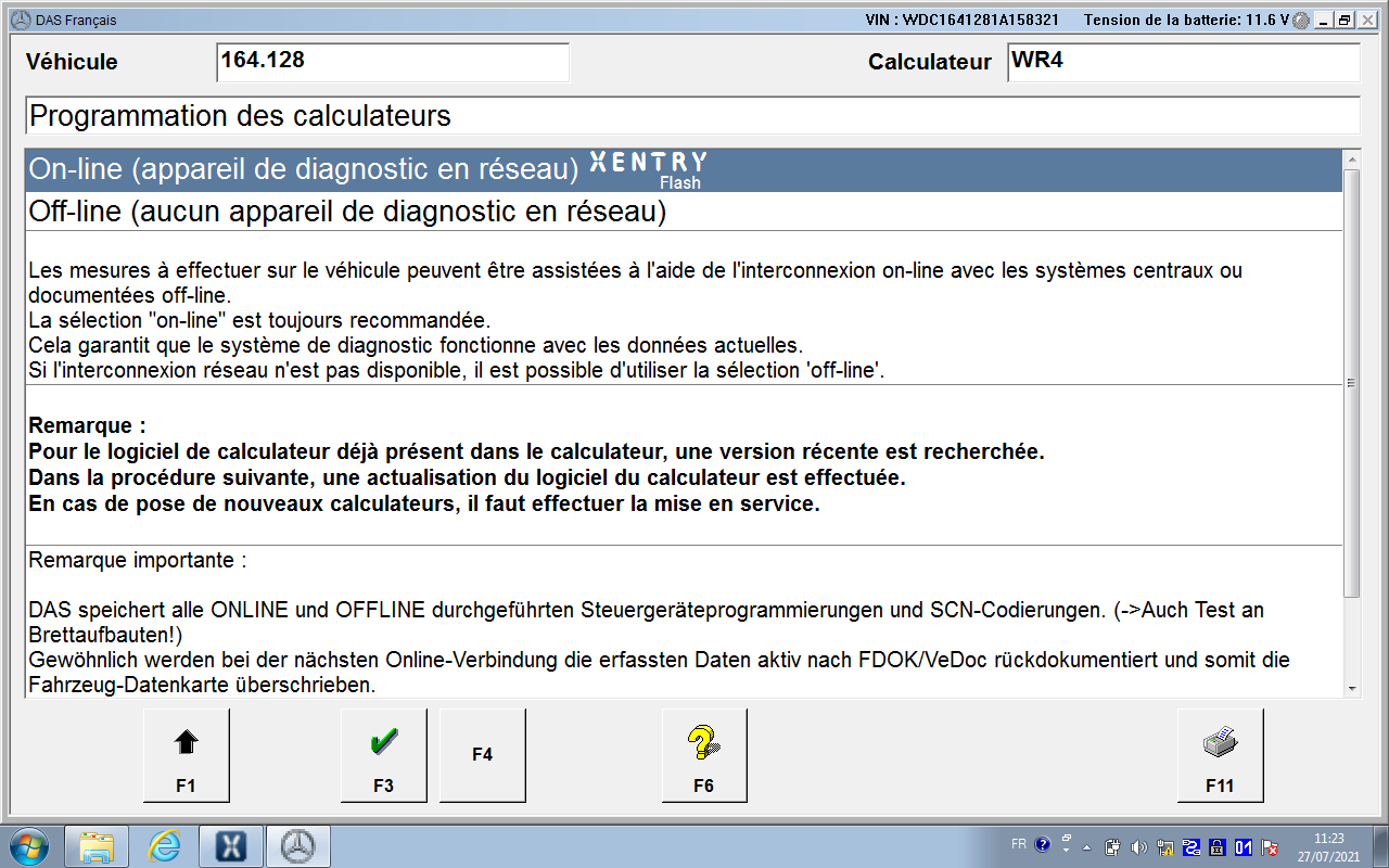Voici un retour. Au démarrage j'ai voulu tester la procédure avec le module passerelle que zenata m'a fourni, juste pour voir si OK déjà de ce côté là, impossible d'avoir le mode offline avec la version de Xentry que j'utilise Après quelques recherches j'ai trouvé un petit utilitaire (dispo sur le HDD) qui lance une invite de commande et qui peut activer/désactiver le menu offline Ensuite j'ai voulu tester avec le module airbag, mais là le menu n'est pas disponible Une mise en service et impossible avec un calculateur déjà monté/occasion car il est verrouillé Le menu dont j'ai parlé et qui me demande un code n'a rien à voir avec ce que je cherche à faire aujourd'hui (normalement j'ai trouvé aussi un utilitaire pour faire sauter ces codes) Suite à ça j'ai essayé de tester le détecteur d'occupation de siège en dynamique avec le soft, et il fonctionne J'ai quand même testé de le désactiver dans les codages Mais idem, toujours ce code défaut à l'effacement des DTC général Et cette erreur à l'effacement des DTC du module airbag J'ai ensuite essayé différent codage dans le module airbag, qui ont été pire car m'ont remontés des DTC que je n'avais pas au départ, car véhicule pas équipé de ces options, j'ai remis les codages à l'origine, mais je ne peux pas effacer les DTC car module verrouillé. Voici les références du module airbag monté actuellement Et voici les icônes présentes sur le bureau A l'heure actuelle je suis donc bloqué et je ne sais plus quoi faire (mise à part un module neuf chez MB, et encore pas sur que je puisse le mettre en service offline (même si déverrouillé). Merci à tous ceux qui m'apporteront leur aide. |