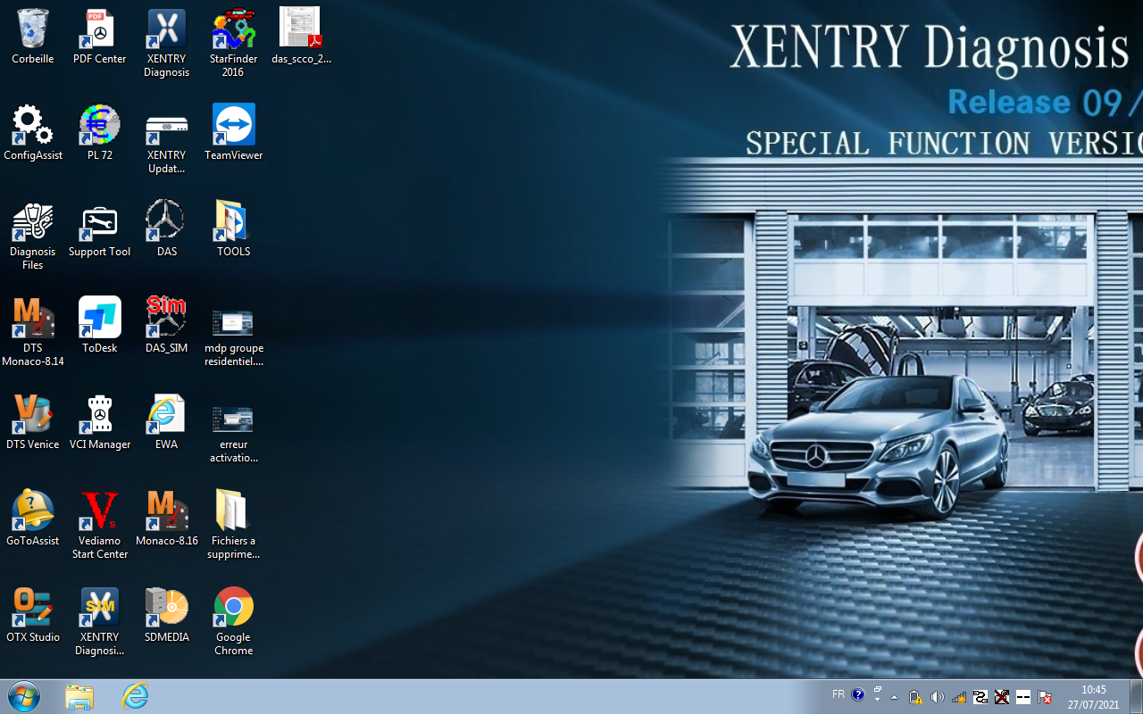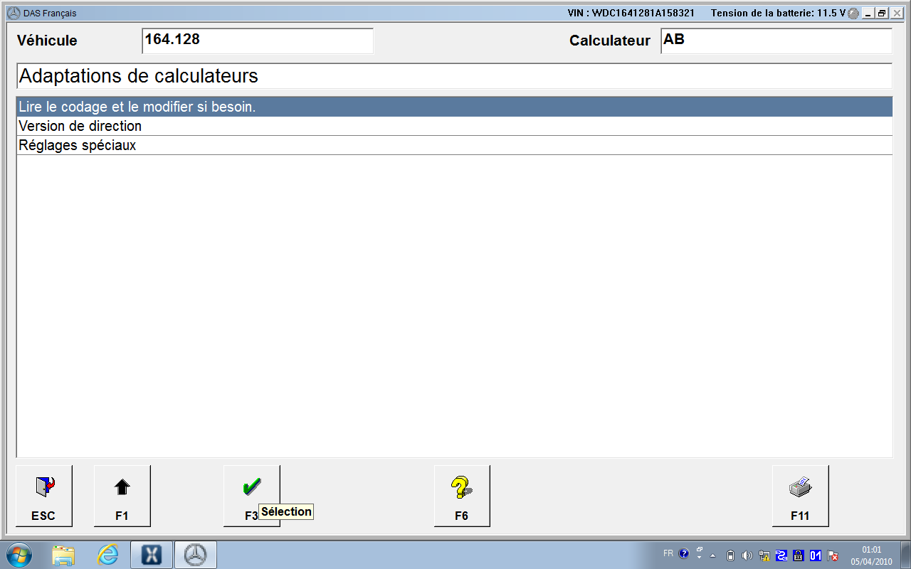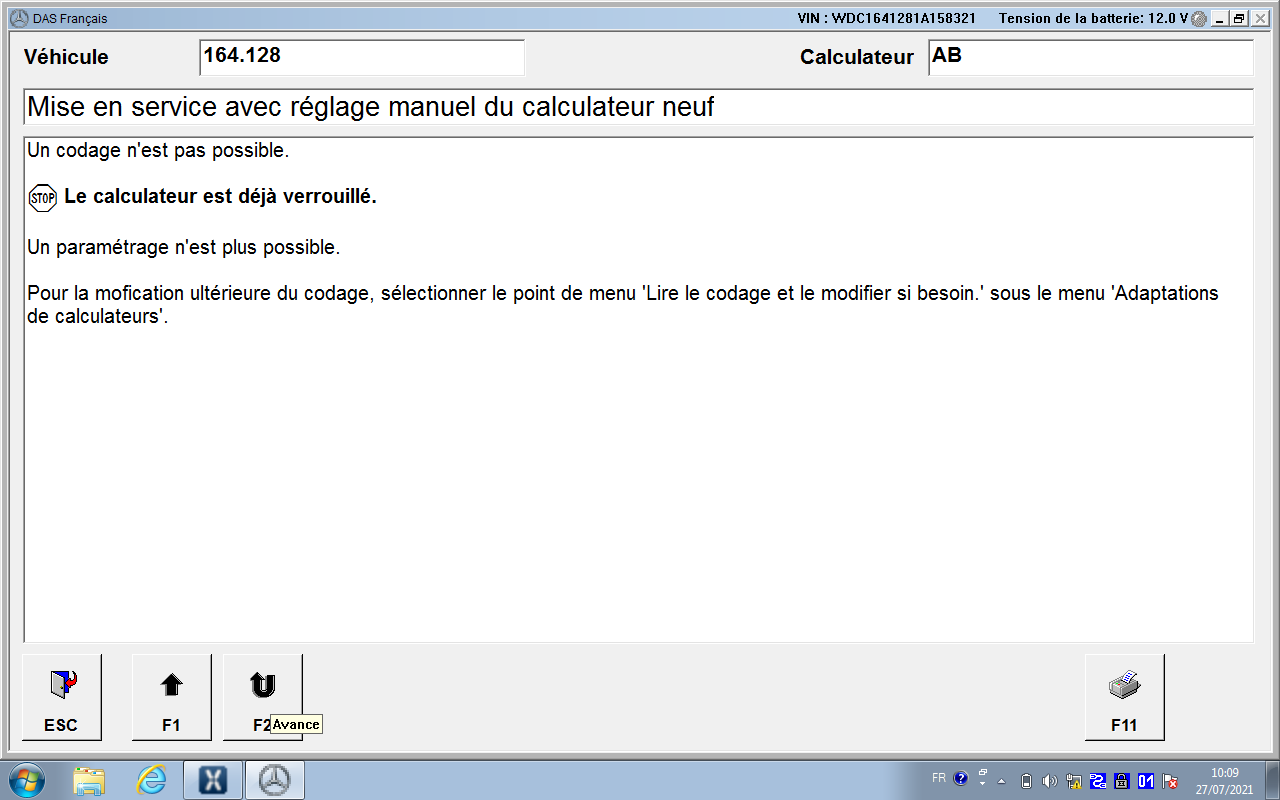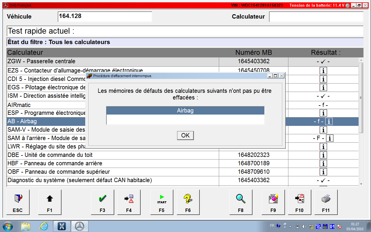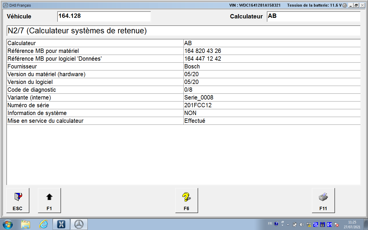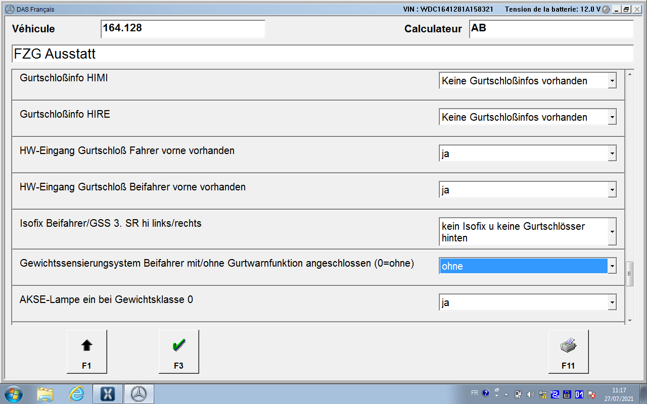 ne pas oublier de le débrancher puis codage Control Units -> Body -> Airbag (AB) -> Development Data -> Control Module Adaptations -> Variant Coding -> Fahrzeugausstatung Kodieren (the last menu entry can be slightly d ifferent in various module variants) Select the drop-down list in the field Airbag Hinten Rechts and Airbag Hinten Links – set to YES. Back up to the main Airbag menu, reset the fault codes, cycle ignition, reset fault codes again and cycle the ignition for 2nd time (this step is very important). Unités de commande -> Carrosserie -> Airbag (AB) -> Données de développement -> Adaptations du module de commande -> Codage des variantes -> Fahrzeugausstatung Kodieren (la dernière entrée de menu peut être légèrement différente dans diverses variantes de module) Sélectionnez la liste déroulante dans le champ Airbag Hinten Rechts et Airbag Hinten Links – définissez sur OUI. Revenez au menu principal Airbag, réinitialisez les codes défauts, faites un cycle d'allumage, réinitialisez les codes défauts et relancez le contact une 2ème fois (cette étape est très importante). ---------- Post added at 11h24 ---------- Previous post was at 11h22 ---------- moi aussi , j'ai pas mes pc avec moi , je suis en vacance j'ai juste un pc et une connexion ---------- Post added at 11h34 ---------- Previous post was at 11h24 ---------- est ce que tu as simulateur xentry icone sur ton écran ???