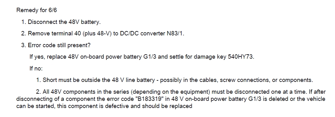 Dans la procédure il t'ai demandé de déconnecter la batterie 48V, puis le + uniquement du convertisseur DC/DC, suit la à la lettre, et d’essayer d'effacer le DTC voir si c'est possible, c'est ce que tu as fait ? Car si c'est le cas et que le DTC n'est pas effaçable, NON, ils ne te demandent pas de remplacer la batterie 48V, mais de rechercher un éventuel court-circuit dans les câbles, connexions et composants qu'alimente la batterie 48V. |