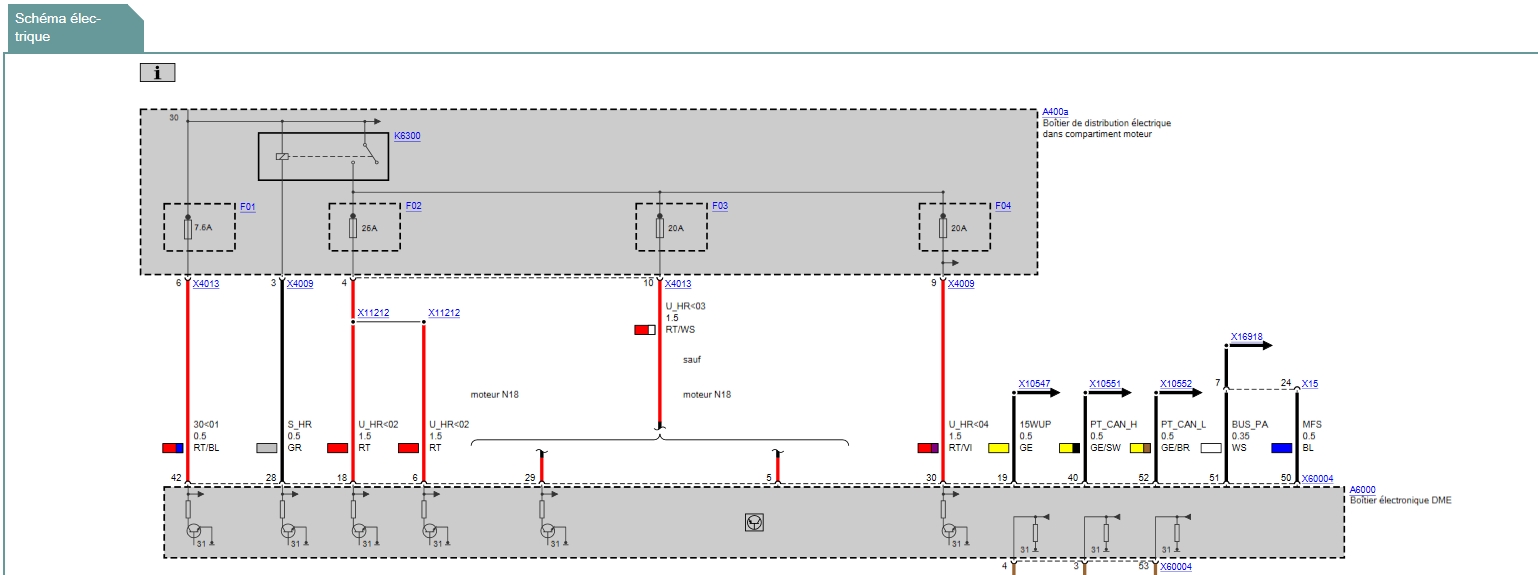 J'ai jamais vu des schémas aussi facile à utiliser (habitué à ElsaWin pour VAG). En tapant les codes d'erreur, j'ai même pu trouver leur signification (ce soft est juste génial). Bref, toutes les erreurs sont liées au bus PT-CAN (y compris le module des commodos d'essuie-glace que j'imaginais sur un autre bus). Donc soit aucun module sur ce bus n'est alimenté, soit le faisceau est interrompu, soit l'ensemble des modules sur ce bus est mort, soit le module JBE qui fait le lien avec le reste est mort. JE vais aussi pouvoir tester le DME sur l'établi en l'alimentant et regardant à l'oscilloscope si les 2 fils du bus PT-CAN ont des signaux. |